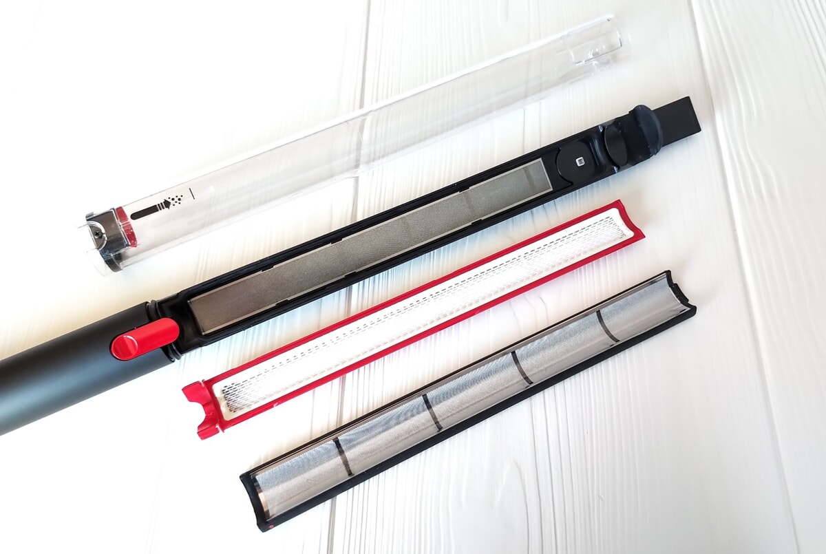 Dyson has also introduced a new dust separation system, ditching cyclonic technology for a fully sealed two-stage linear system, which captures 99.99% of microscopic particles and allergens down to 0.3 microns. Inside the dust container we find three removable elements: a stainless steel pre-filtration grid which captures approximately 70% of the dirt, a plastic one and a pleated microfibre filter to maximize the surface of the material.