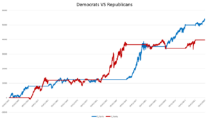 In Figure 2, we have reported the cumulative equity line of two hypothetical strategies: one that invests only during democratic presidential mandates and the other that does it exclusively during the Republican ones. The backtest starts from 1945 and extends until January 20, 2025, using a capital of $ 10,000 for each operation.