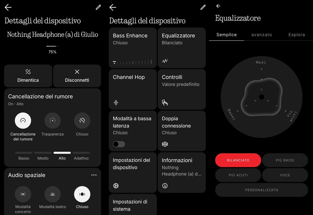 Let’s now analyze the Nothing X app for iOS and Android that accompanies these headphones. Application in Italian, with neat, complete and easy-to-use graphics.