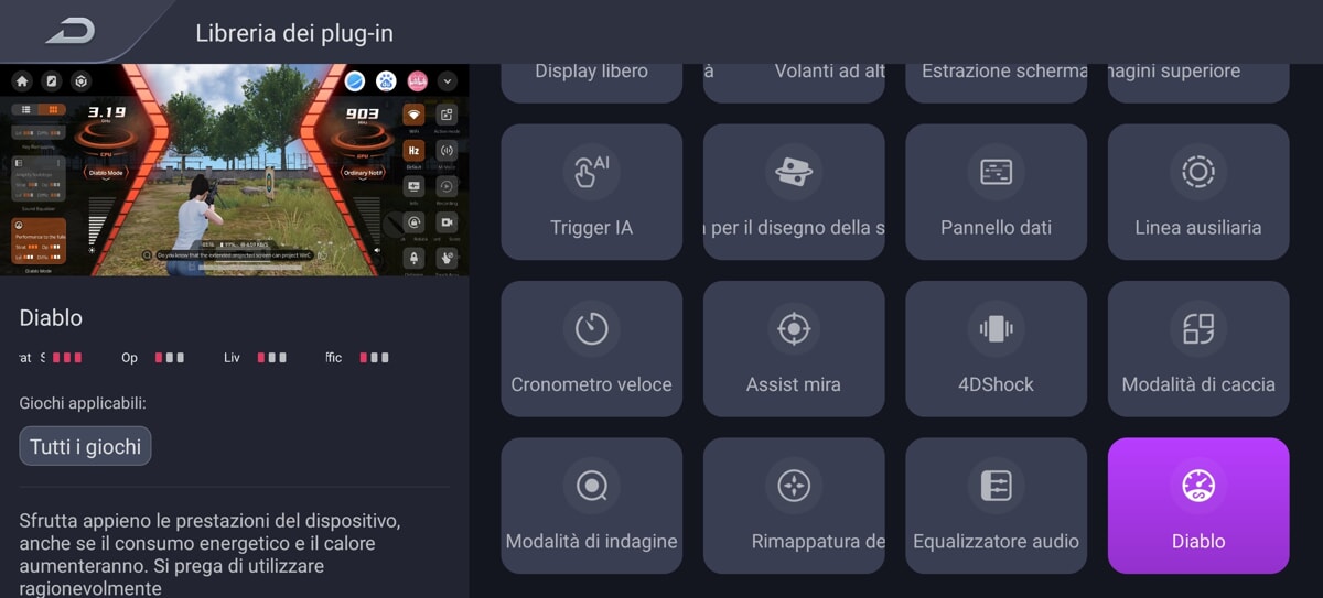 In the nubia Z80 Ultra we also find the “Game Space”: menu dedicated to video games, also accessible via the selector on the left side of the smartphone. Inside each video game there are two side panels that can be activated by swiping towards the center of the screen. Menus that allow you to manage many features, such as monitoring CPU and GPU frequency, screen recording, call blocking and much more. We also find the section of plug-ins that add various features within video games, such as the possibility of enabling a large crosshair (useful in FPS) or activating a magnifying glass. We also mention the “Diablo Mode” which pushes the smartphone’s performance to the maximum.